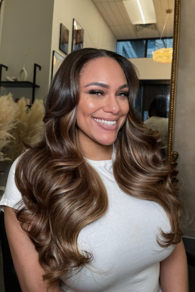 You bring timeless glamour with soft barrel curls that look rich and shiny under any light.