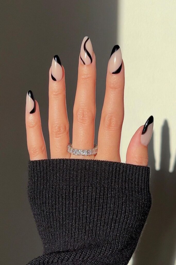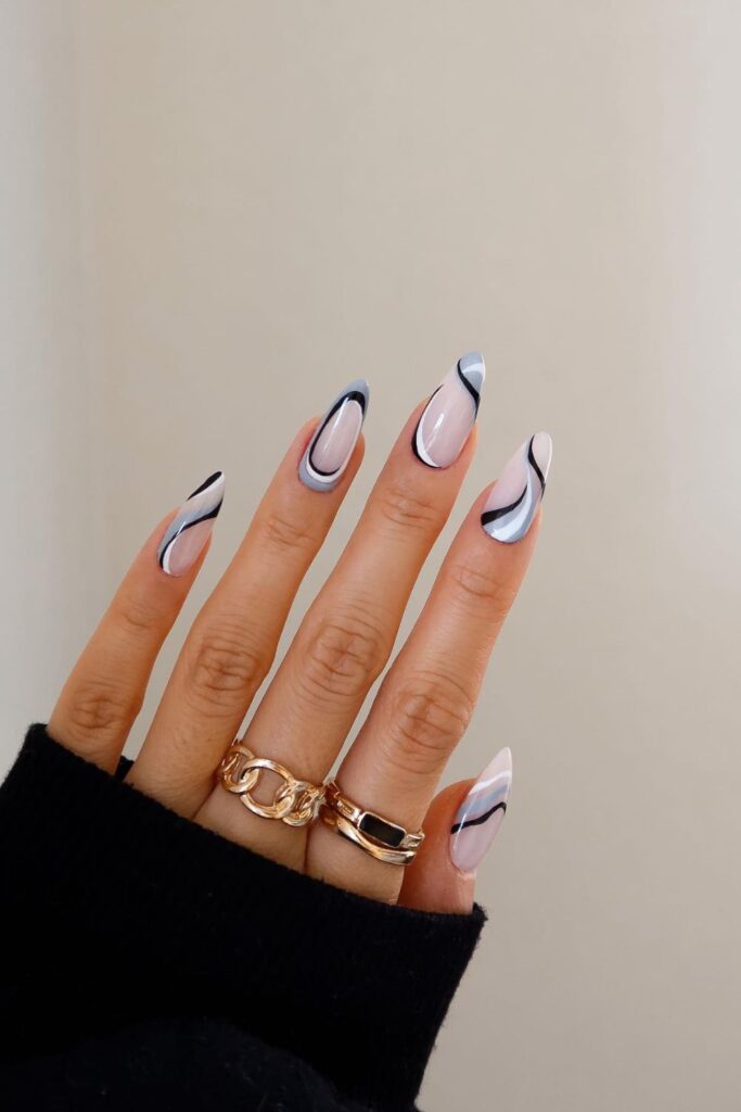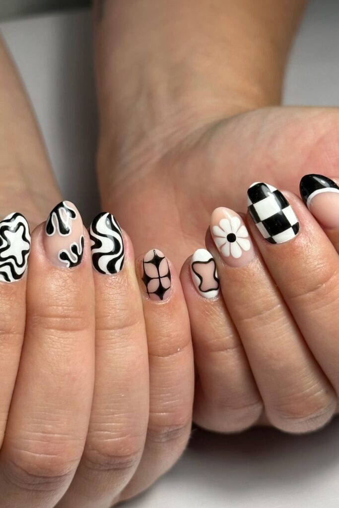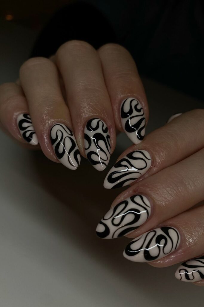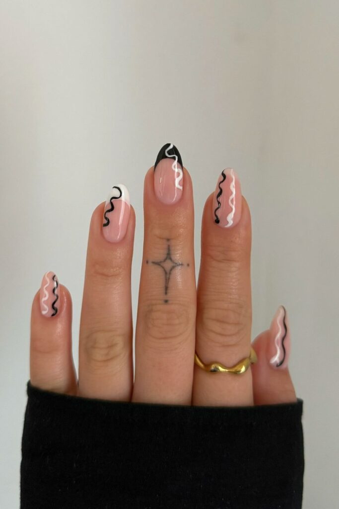 You balance soft nude bases with playful black-and-white swirls that instantly stand out.