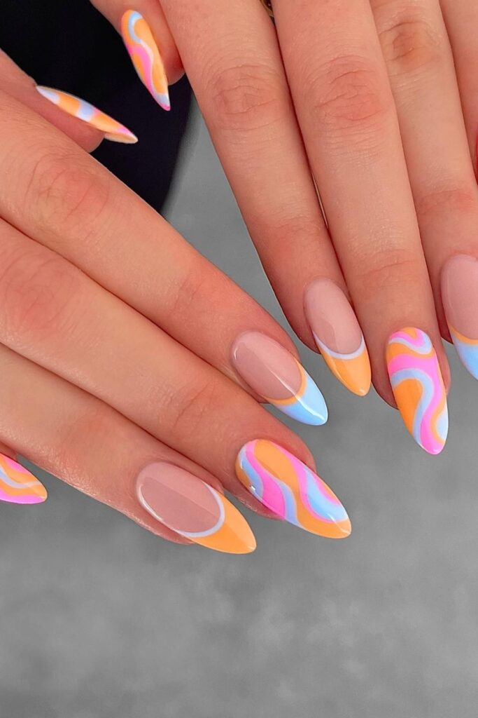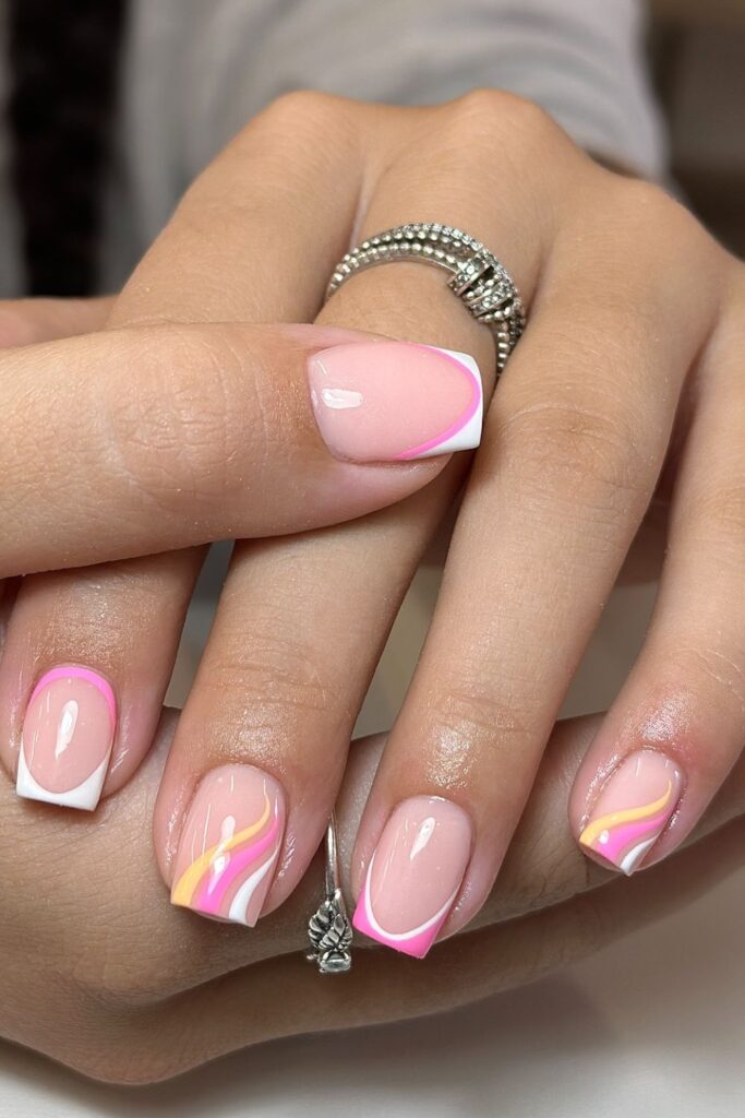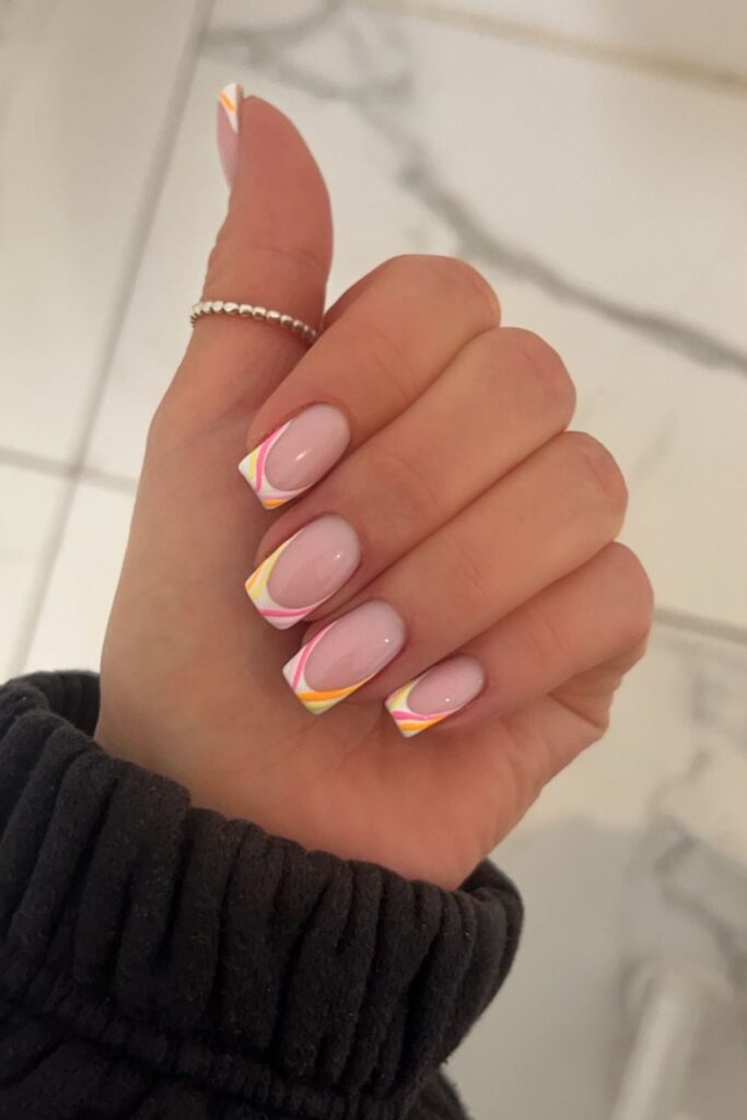 You keep a fresh French look but shift it with orange, yellow, and pink swoops that frame the square tips.