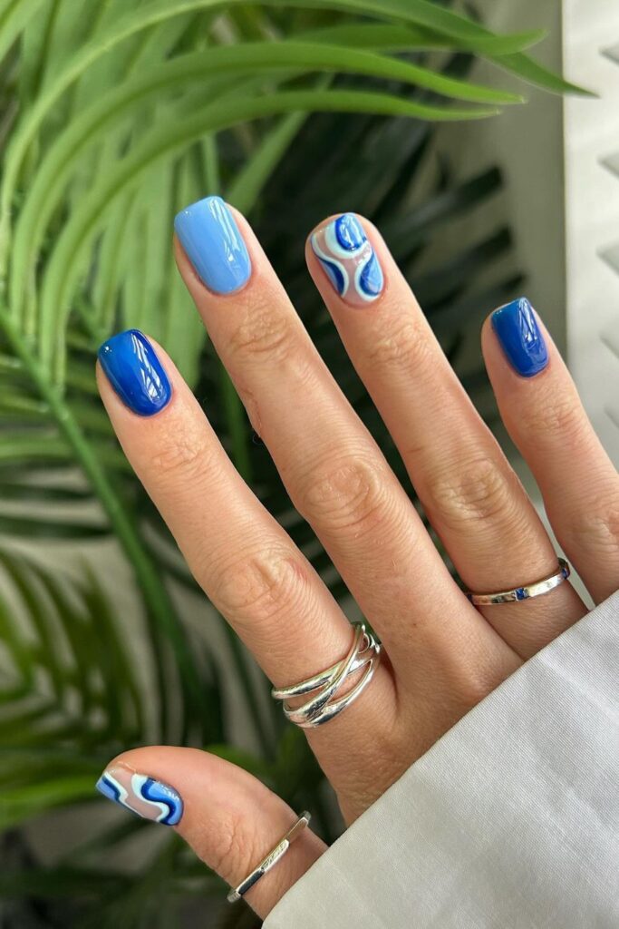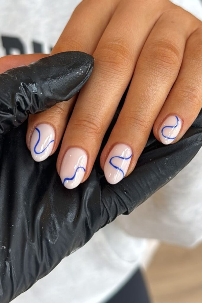 You pair clean nude nails with confident blue single swirl on each one.