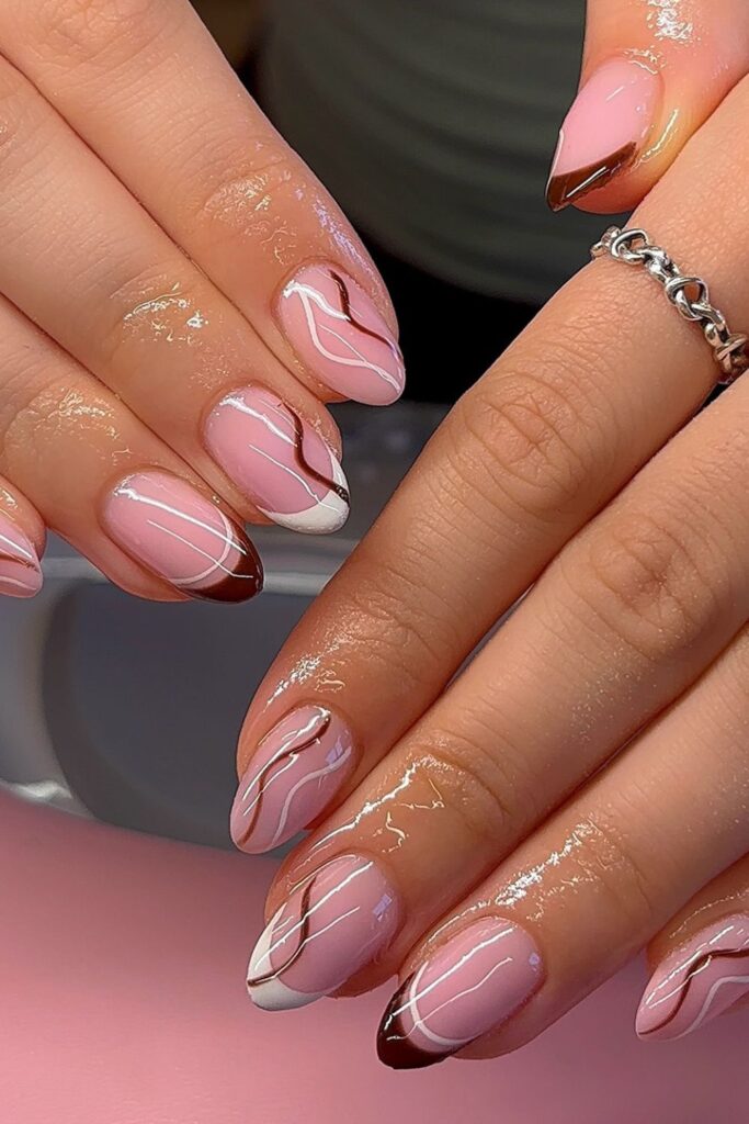 You use brown and white swirls that climb the nail like glowing waves.