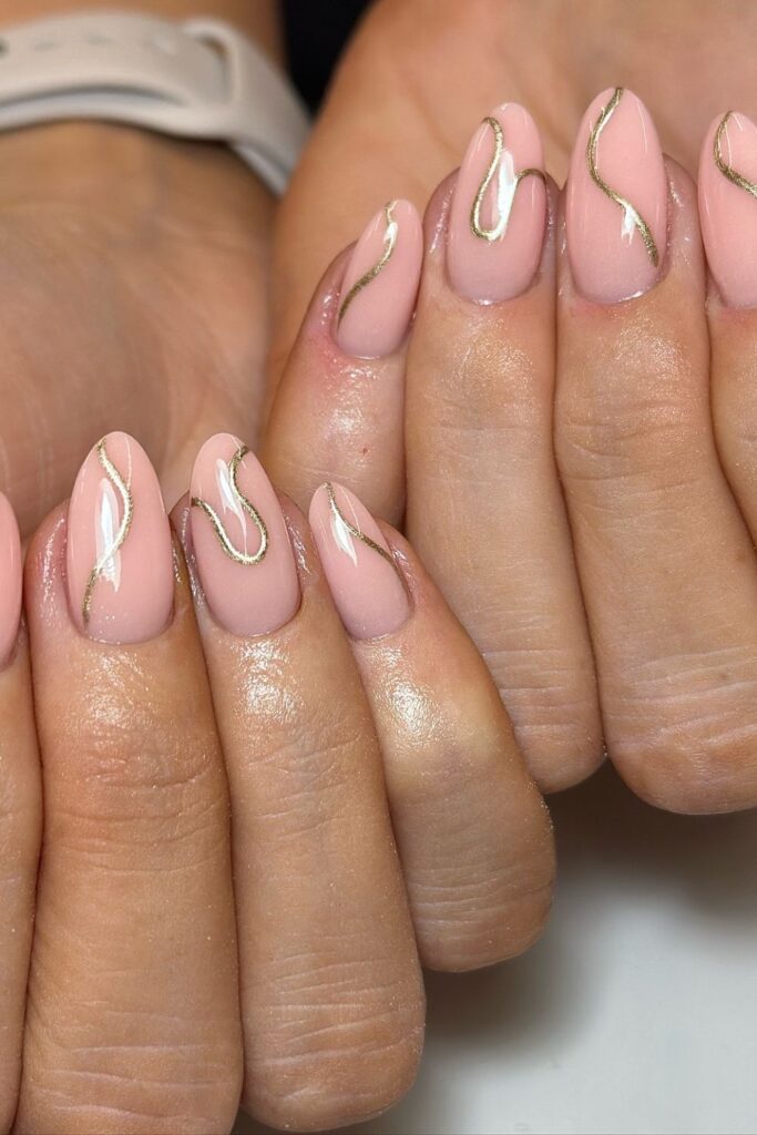 You choose thin gold paths on a nude base when you want quiet glam that still feels fresh.