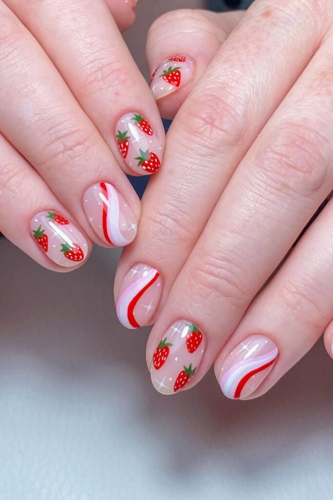 You enjoy the cute mix of red swirl accents and tiny strawberry art that turns a simple nude base into a fun summer detail.