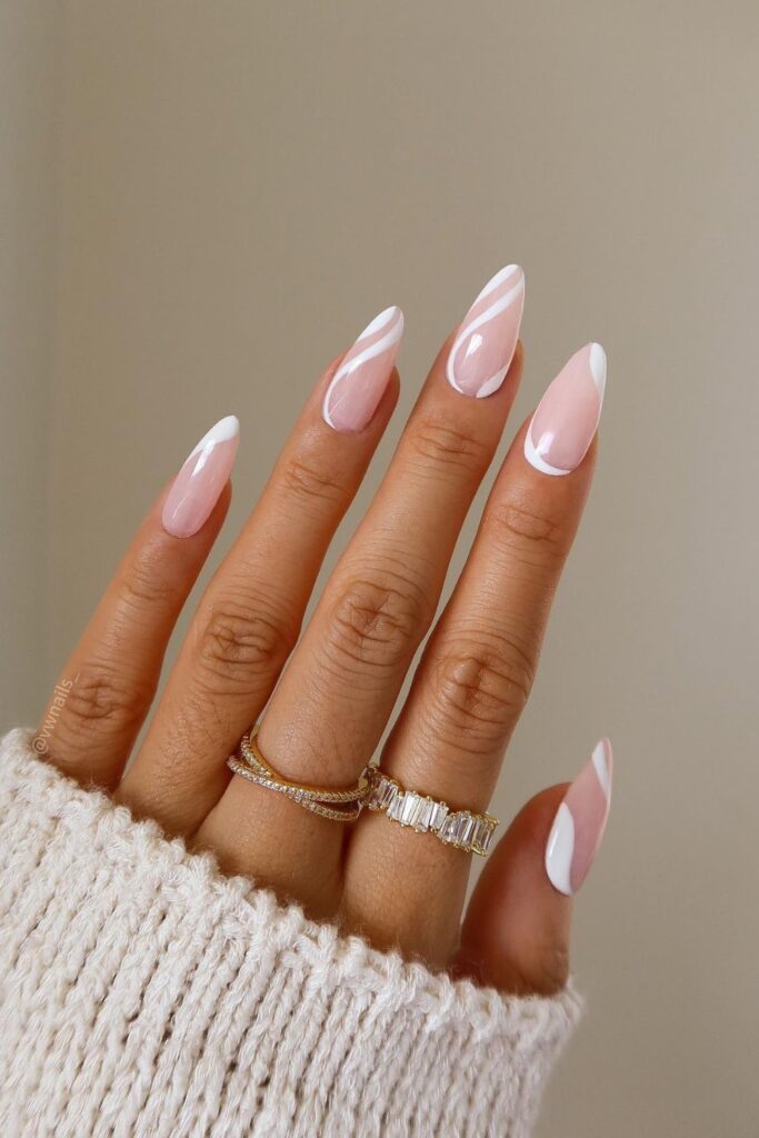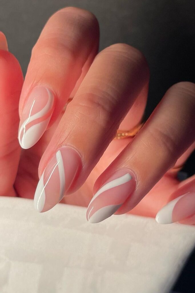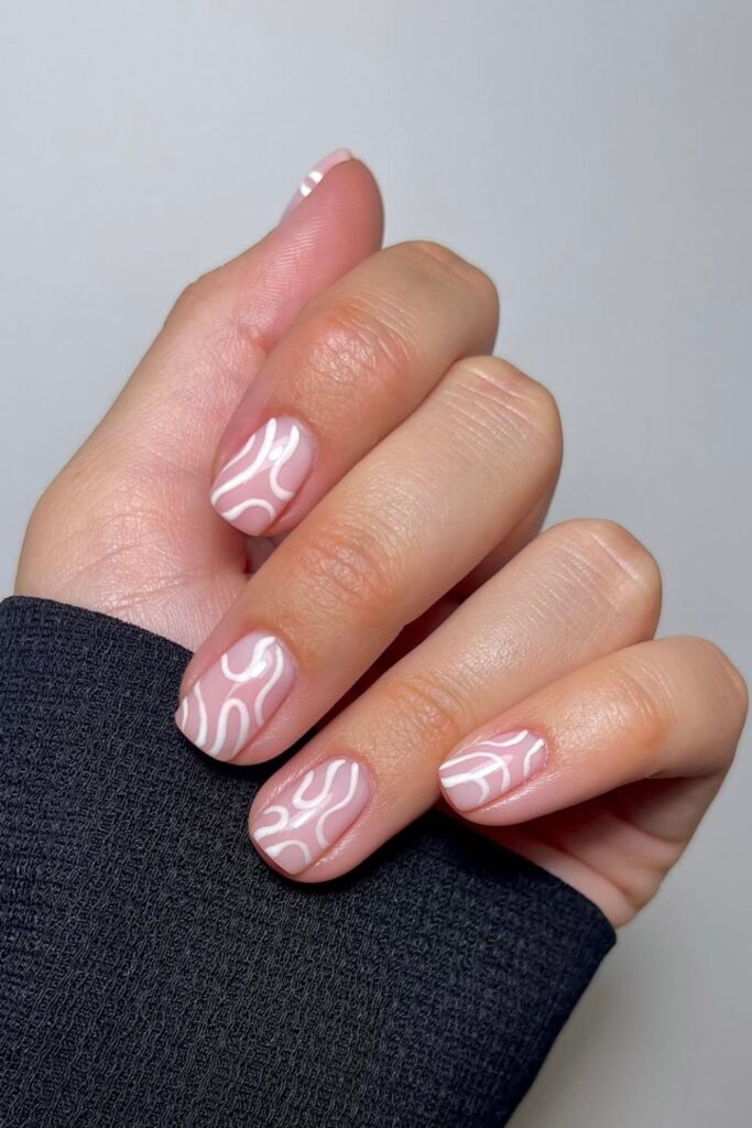 You prefer a soft pink base that lets the white curves look crisp and tidy on short nails.