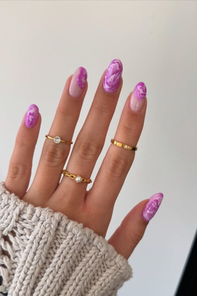 You turn your nails into a bold accessory by choosing a swirling purple marble effect that gives depth to every curve.