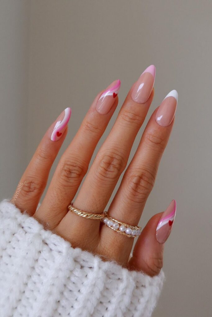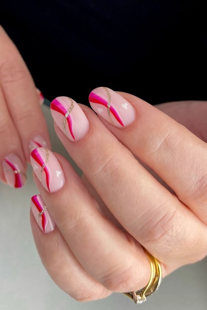 You bring a sweet touch with small red hearts placed on soft pink swirl curves that sit across a nude base.