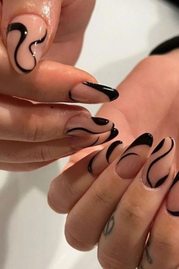 You shape the nude base with bold black curves that trace each nail in a dramatic way.