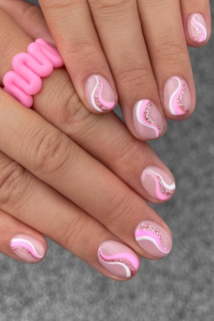 Cause you want this effect, ask for a nude base with one pastel curve and one glitter path on every nail for a cute look.