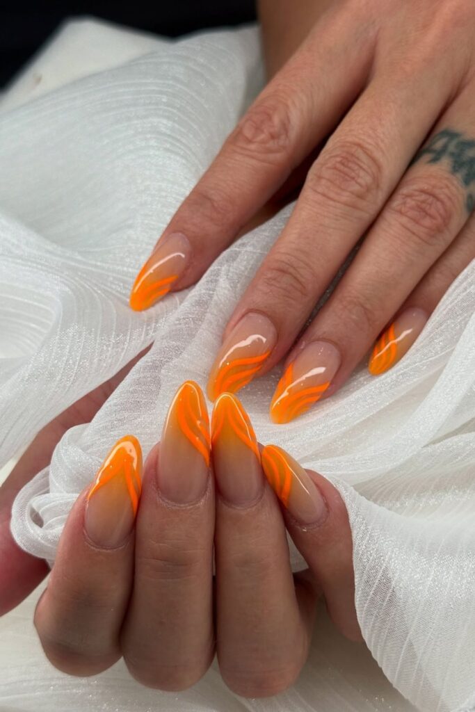 This effect comes out best when you ask for a nude base with stacked thin orange arcs on every tip.